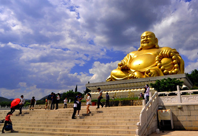 錦屏山風(fēng)景區(qū)坐落在彌勒縣城北風(fēng)景如畫的錦屏山上,位于昆河公路沿線,距彌勒縣城僅10公里,距省會昆明130公里,距石林風(fēng)景區(qū)40公里。彌勒素有南滇福地之稱,彌勒因寺而名重,寺因彌勒而名傳。錦屏山雖不高,但山形獨特,鐘靈毓秀,氣勢磅礴,粗看像一道巨大的屏風(fēng),呵護著美麗富饒的峨山甸水;細(xì)看則像一尊景白天成的彌勒佛,結(jié)迦趺坐,護佑眾生。