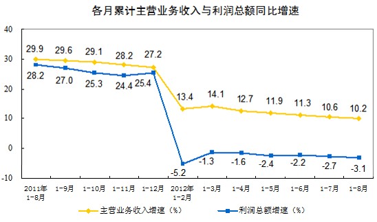 1-8月份,全國(guó)規(guī)模以上工業(yè)企業(yè)實(shí)現(xiàn)利潤(rùn)30597億元,同比下降3.1%。8月當(dāng)月實(shí)現(xiàn)利潤(rùn)3812億元,同比下降6.2%。