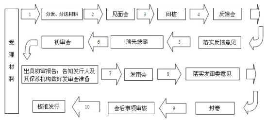 按照依法行政、公開透明、集體決策、分工制衡的要求,首次公開發(fā)行股票(以下簡稱首發(fā))的審核工作流程分為受理、見面會(huì)、問核、反饋會(huì)、預(yù)先披露、初審會(huì)、發(fā)審會(huì)、封卷、會(huì)后事項(xiàng)、核準(zhǔn)發(fā)行等主要環(huán)節(jié),分別由不同處室負(fù)責(zé),相互配合、相互制約。對(duì)每一個(gè)發(fā)行人的審核決定均通過會(huì)議以集體討論的方式提出意見,避免個(gè)人決斷。