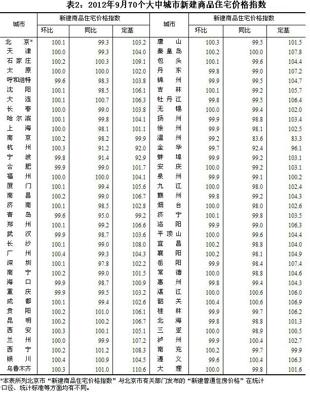 2012年9月份70個(gè)大中城市住宅銷售價(jià)格變動(dòng)情況