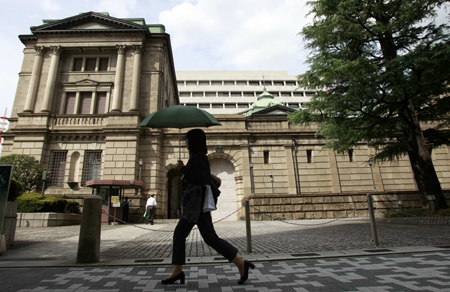 22日,日本央行在各分行行長季度會議上公布10月份季度性區(qū)域報告,下調(diào)了日本9個地區(qū)中8個地區(qū)的經(jīng)濟(jì)評估。日本央行行長白川方明在會議上表示,將通過穩(wěn)步擴(kuò)大資產(chǎn)購買計劃規(guī)模繼續(xù)放松貨幣政策。 圖為一行人經(jīng)過日本央行大樓。