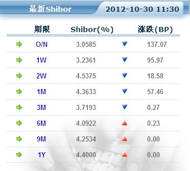 10月30日上午消息,繼央行上午進(jìn)行3950億元天量逆回購(gòu)后,上海銀行間同業(yè)拆放利率(Shibor)應(yīng)聲回落,其中隔夜利率回落137.07基點(diǎn),一周品種回落95.75基點(diǎn)?傮w而言,期限越短,回落越明顯。