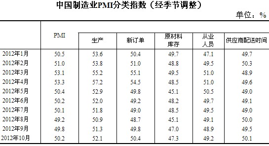 2012年10月,中國(guó)制造業(yè)采購(gòu)經(jīng)理指數(shù)(PMI)為50.2%,比上月上升0.4個(gè)百分點(diǎn),重新回到臨界點(diǎn)之上。