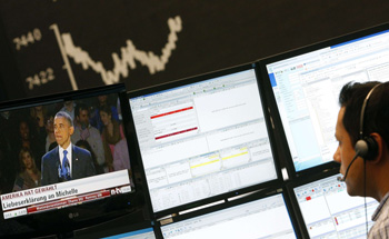 當(dāng)?shù)貢r(shí)間7日,法蘭克福交易所中,一名股票交易員正在觀看美國(guó)總統(tǒng)奧巴馬成功連任后進(jìn)行演說(shuō)的電視直播。(路透) |