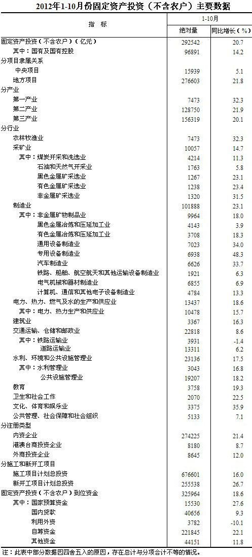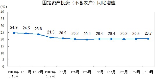 2012年1-10月份,全國固定資產(chǎn)投資(不含農(nóng)戶)292542億元,同比名義增長20.7%,增速比1-9月份加快0.2個百分點。從環(huán)比看,10月份固定資產(chǎn)投資(不含農(nóng)戶)增長1.94%。