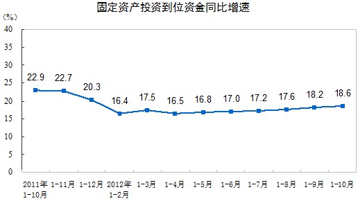 從到位資金情況看,1-10月份,到位資金325964億元,同比增長18.6%,增速比1-9月份提高0.4個百分點。其中,國家預(yù)算資金增長27.6%,增速提高0.2個百分點;國內(nèi)貸款增長9.3%,提高0.5個百分點;自籌資金增長22.1%,提高0.2個百分點;利用外資下降10.1%,降幅比1-9月份擴大3.8個百分點;其他資金增長11.8%,提高1.5個百分點。