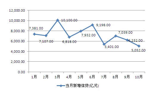 央行2012年11月12日公布社會融資規(guī)模數(shù)據(jù),數(shù)據(jù)顯示10月人民幣信貸增加5052億元,創(chuàng)下了自2011年10月以來13個月新低,同比少增816億元。