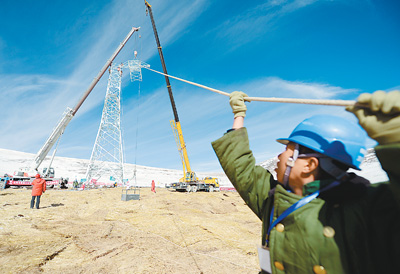 2012年11月6日11時(shí)45分,在海拔4915.7米的巴顏喀拉山口,5名高空作業(yè)人員通力協(xié)作,將玉樹電網(wǎng)與青海主網(wǎng)330千伏聯(lián)網(wǎng)工程第1237號(hào)鐵塔的最后一組塔材組裝完畢。至此,這座工程全線海拔最高的鐵塔巋然矗立,如同巨人一般遙望正南方向的玉樹地區(qū)。