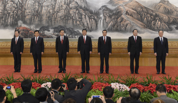 習(xí)近平說,剛才,我們召開了中國共產(chǎn)黨第十八屆中央委員會第一次全體會議,選舉產(chǎn)生了新一屆中央領(lǐng)導(dǎo)機構(gòu),選舉我為中央委員會總書記。習(xí)近平逐一介紹了新當(dāng)選的其他6位中央政治局常委,代表新一屆中央領(lǐng)導(dǎo)機構(gòu)成員感謝全黨同志的信任,并表示定當(dāng)不負(fù)重托,不辱使命。他說,全黨同志的重托,全國各族人民的期望,是對我們做好工作的巨大鼓舞,也是我們肩上的重大責(zé)任。