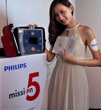 荷蘭飛利浦公司目前在香港推出新研發(fā)的自動調(diào)控溫度的電熨斗、藍牙無線遙控高保真音響系統(tǒng)、用于心臟病急救的家用體外自動除顫器等一批家電用品。圖為一名模特在現(xiàn)場展示飛利浦的體外自動除顫器。記者