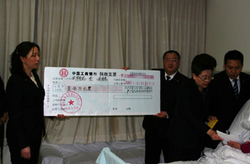 客戶尚先生于2008年10月在新華保險先后投保了福如東海A款終身壽險,附加提前給付重大疾病保險A款以及吉利相伴A款兩全保險。今年3月,尚先生被確診為結(jié)腸癌晚期,病情危重隨時危及生命。得知這一情況后,新華保險積極組織理賠工作,迅速啟動理賠綠色通道。3月23日晚,全國勞動模范、新華保險功勛總監(jiān)、海淀聯(lián)合營業(yè)區(qū)總經(jīng)理金愛麗親自將提前給付的福如東海A款終身壽險,附加提前給付重大疾病保險A款100萬元大額理賠金送到正在接受治療的尚先生手中。