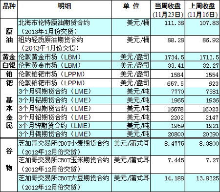 國際大宗商品期貨價(jià)格明細(xì)表[2012-11-26]