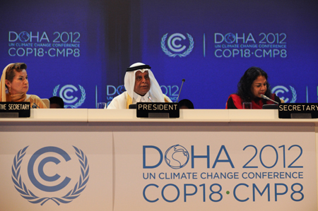 11月26日,在卡塔爾首都多哈,聯(lián)合國氣候變化多哈會議主席阿卜杜拉·阿提亞(中)、《聯(lián)合國氣候變化框架公約》秘書處執(zhí)行秘書克里斯蒂娜·菲格雷斯(左)出席開幕式。 當(dāng)?shù)貢r間當(dāng)日上午,《聯(lián)合國氣候變化框架公約》第18次締約方會議暨《京都議定書》第8次締約方會議(簡稱多哈氣候大會)在多哈開幕。
