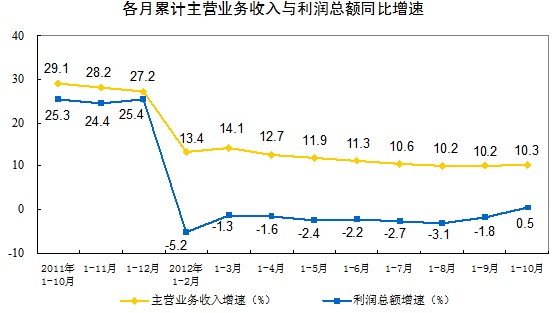 1-10月份,全國規(guī)模以上工業(yè)企業(yè)實現(xiàn)利潤40240億元,同比增長0.5%。10月當月實現(xiàn)利潤5001億元,同比增長20.5%。