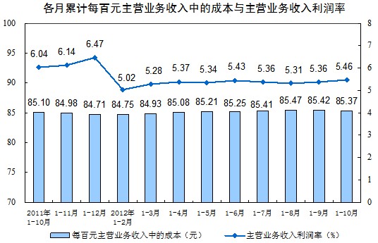 規(guī)模以上工業(yè)企業(yè)實現(xiàn)主營業(yè)務(wù)收入736970億元,同比增長10.3%。每百元主營業(yè)務(wù)收入中的成本為85.37元,主營業(yè)務(wù)收入利潤率為5.46%。