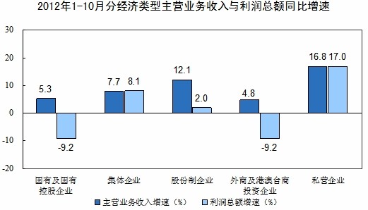 1-10月份,在規(guī)模以上工業(yè)企業(yè)中,國有及國有控股企業(yè)實現(xiàn)利潤11270億元,同比下降9.2%;集體企業(yè)實現(xiàn)利潤630億元,同比增長8.1%;股份制企業(yè)實現(xiàn)利潤23526億元,同比增長2%;外商及港澳臺商投資企業(yè)實現(xiàn)利潤9195億元,同比下降9.2%;私營企業(yè)實現(xiàn)利潤12623億元,同比增長17%。