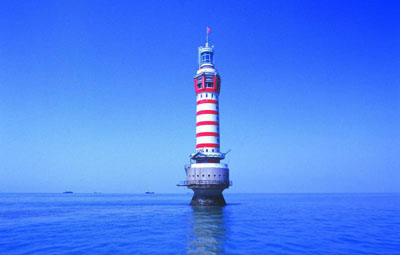 大沽燈塔矗立在大沽口外的海面上,建于1978年,高達(dá)56.45米,是我國(guó)目前自行設(shè)計(jì)、自行建造的第一座海上最高燈塔。2006年5月22日,國(guó)家郵政局發(fā)行了一套特種郵票《現(xiàn)代燈塔》,共四枚,第一枚便是大沽燈塔。燈塔呈圓型,外部飾以白瓷磚和紅白玻璃,紅白相間,具有一種和諧美。塔頂裝有巨型燈具,無論陰、晴、雨、霧,都能發(fā)光導(dǎo)航。尤其是夜間,可以發(fā)出旋轉(zhuǎn)著的強(qiáng)烈興束,射程達(dá)70海里。這座宏偉的12層燈塔,成為塘沽新港的象征。