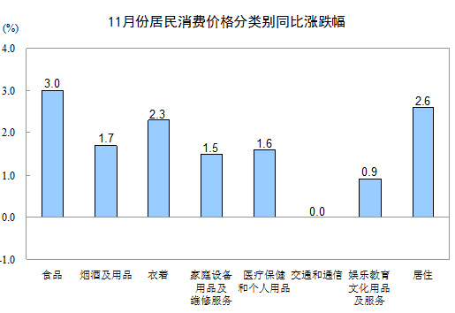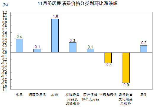11月份,全國居民消費價格總水平環(huán)比上漲0.1%。其中,城市上漲0.1%,農村上漲0.2%;食品價格上漲0.4%,非食品價格持平;消費品價格上漲0.3%,服務項目價格下降0.3%。