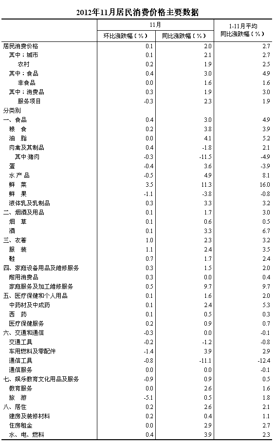 2012年11月份,全國居民消費價格總水平同比上漲2.0%。其中,城市上漲2.1%,農村上漲1.9%;食品價格上漲3.0%,非食品價格上漲1.6%;消費品價格上漲1.9%,服務項目價格上漲2.3%。1-11月平均,全國居民消費價格總水平比去年同期上漲2.7%。
