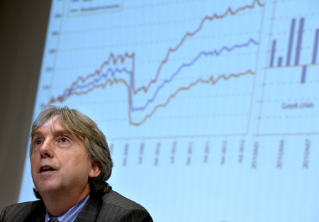 12月18日,在美國(guó)紐約聯(lián)合國(guó)總部,報(bào)告撰寫(xiě)小組負(fù)責(zé)人、聯(lián)合國(guó)經(jīng)濟(jì)和社會(huì)事務(wù)部發(fā)展政策分析司司長(zhǎng)羅伯特·沃斯在新聞發(fā)布會(huì)上介紹《2013年世界經(jīng)濟(jì)形勢(shì)與展望》報(bào)告的相關(guān)內(nèi)容。