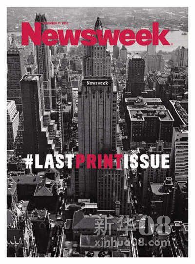美國知名雜志《新聞周刊》最后一期印刷版將于12月31日在各報(bào)刊亭正式銷售。當(dāng)?shù)貢r(shí)間12月23日,該雜志網(wǎng)站發(fā)布了最后一期印刷版封面——一張?jiān)撾s志位于美國紐約市辦公大樓的黑白照片,照片上方為該刊發(fā)行日期(2012年12月31日),中下部則配以“最后一期印刷版”的字樣,充滿了離愁別緒。而在“最后一期印刷版”字樣的前面使用了“#”字標(biāo)簽。這不僅意味著《新聞周刊》以詩化的方式向社交媒體致意,且表明社交媒體是導(dǎo)致該雜志紙質(zhì)刊物走到盡頭的原因之一。
