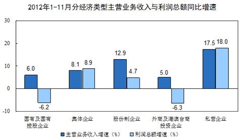 1-11月份在規(guī)模以上工業(yè)企業(yè)中,國有及國有控股企業(yè)實(shí)現(xiàn)利潤12585億元,同比下降6.2%;集體企業(yè)實(shí)現(xiàn)利潤711億元,同比增長8.9%;股份制企業(yè)實(shí)現(xiàn)利潤27304億元,同比增長4.7%;外商及港澳臺商投資企業(yè)實(shí)現(xiàn)利潤10731億元,同比下降6.3%;私營企業(yè)實(shí)現(xiàn)利潤14946億元,同比增長18%。