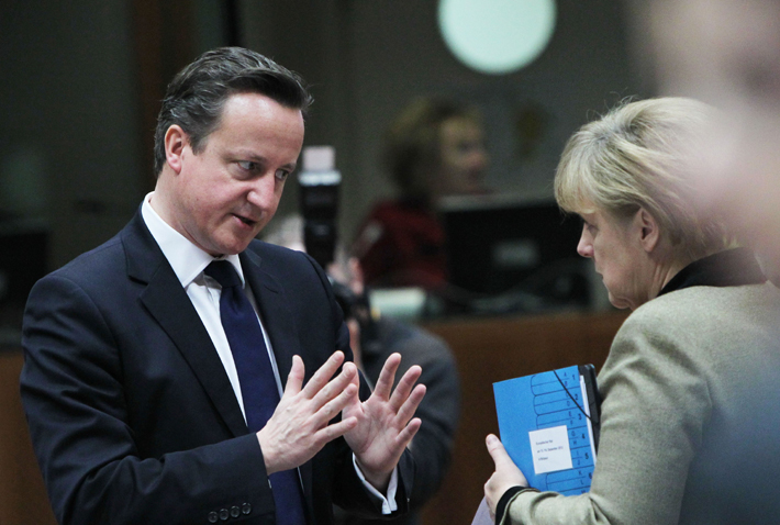 2012年12月14日,在比利時(shí)首都布魯塞爾舉行的歐盟峰會(huì)第二天會(huì)議上,英國(guó)首相卡梅倫(左)與德國(guó)總理默克爾交談。新華社記者