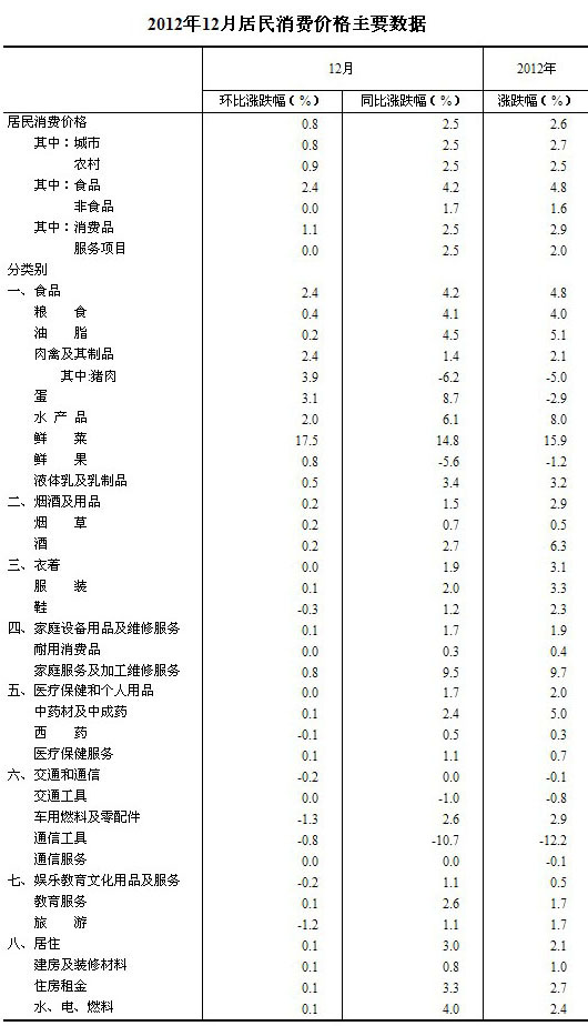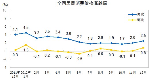 2012年12月份,全國居民消費價格總水平同比上漲2.5%。其中,城市上漲2.5%,農(nóng)村上漲2.5%;食品價格上漲4.2%,非食品價格上漲1.7%;消費品價格上漲2.5%,服務(wù)項目價格上漲2.5%。2012年,全國居民消費價格總水平比上年上漲2.6%。