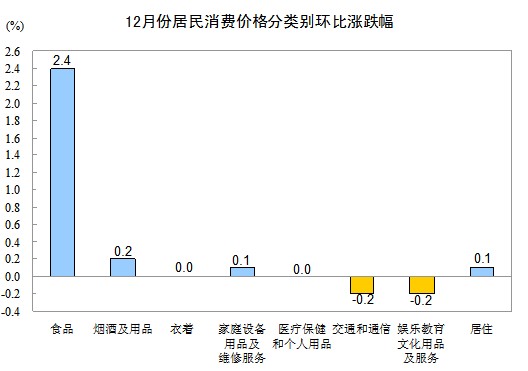 12月份,食品價格同比上漲4.2%,影響居民消費價格總水平同比上漲約1.37個百分點。其中,鮮菜價格上漲14.8%,影響居民消費價格總水平上漲約0.41個百分點;水產(chǎn)品價格上漲6.1%,影響居民消費價格總水平上漲約0.15個百分點;糧食價格上漲4.1%,影響居民消費價格總水平上漲約0.12個百分點;肉禽及其制品價格上漲1.4%,影響居民消費價格總水平上漲約0.11個百分點(豬肉價格下降6.2%,影響居民消費價格總水平下降約0.22個百分點);油脂價格上漲4.5%,影響居民消費價格總水平上漲約0.06個百分點;鮮果價格下降5.6%,影響居民消費價格總水平下降約0.11個百分點。