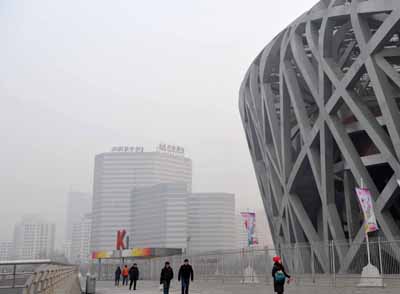 1月13日,國家體育場“鳥巢”周邊地區(qū)被霧霾籠罩。