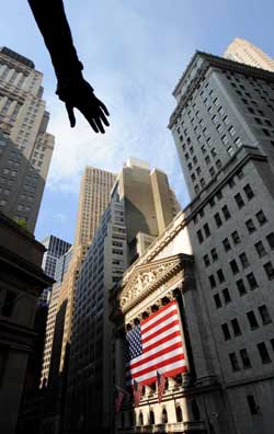 在美國紐約華爾街,華盛頓雕像的手臂指向晨光中的紐約證券交易所。記者 申宏