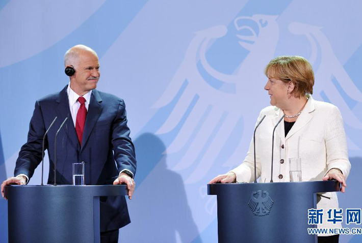 2011年9月27日,德國總理默克爾(右)和希臘總理帕潘德里歐在柏林出席新聞發(fā)布會。當日,默克爾在柏林總理府會見到訪的帕潘德里歐,雙方將就如何進一步援助希臘展開討論。
