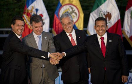 1月27日,墨西哥總統(tǒng)涅托(左一),哥倫比亞總統(tǒng)桑托斯(左二),智利總統(tǒng)皮涅拉(左三)與秘魯總統(tǒng)烏馬拉在智利首都圣地亞哥舉行的新聞發(fā)布會(huì)上合影。 當(dāng)日,太平洋聯(lián)盟四國(guó)總統(tǒng)在智利首都圣地亞哥宣布,將于今年3月31日前開(kāi)放成員國(guó)間90%產(chǎn)品的關(guān)稅。