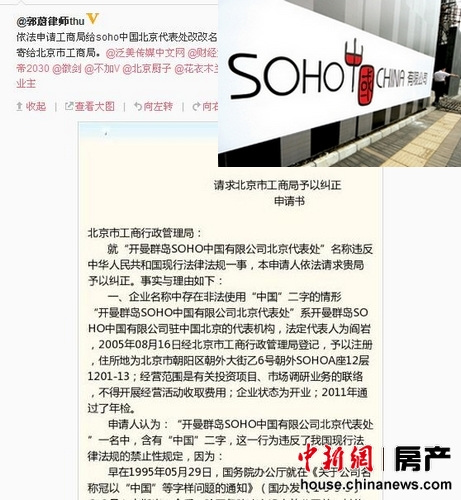SOHO中國涉嫌串通“房姐”洗錢風(fēng)波未停,其企業(yè)名稱“開曼群島SOHO中國有限公司北京代表處”又被指涉嫌違法違規(guī)。昨天,有律師身份的網(wǎng)友在微博公開了一份申請書,要求北京市工商行政管理局將SOHO中國企業(yè)名稱中的“中國”二字去掉。