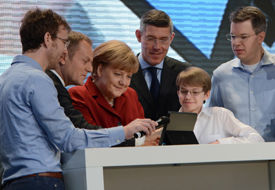3月5日,在德國(guó)漢諾威IT展現(xiàn)場(chǎng),德國(guó)總理默克爾和波蘭總理圖斯克Donald Tusk(左二)參觀微軟公司展臺(tái)。