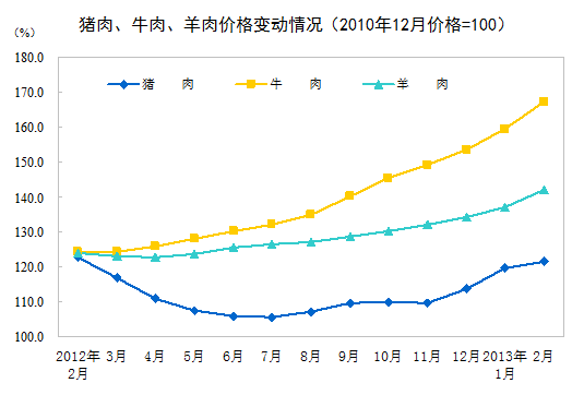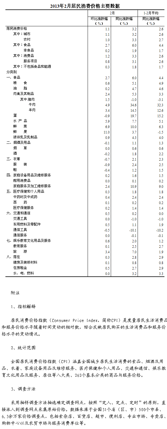 2013年2月份,全國居民消費(fèi)價格總水平同比上漲3.2%。其中,城市上漲3.2%,農(nóng)村上漲3.3%;食品價格上漲6.0%,非食品價格上漲1.9%;消費(fèi)品價格上漲3.3%,服務(wù)價格上漲3.1%。