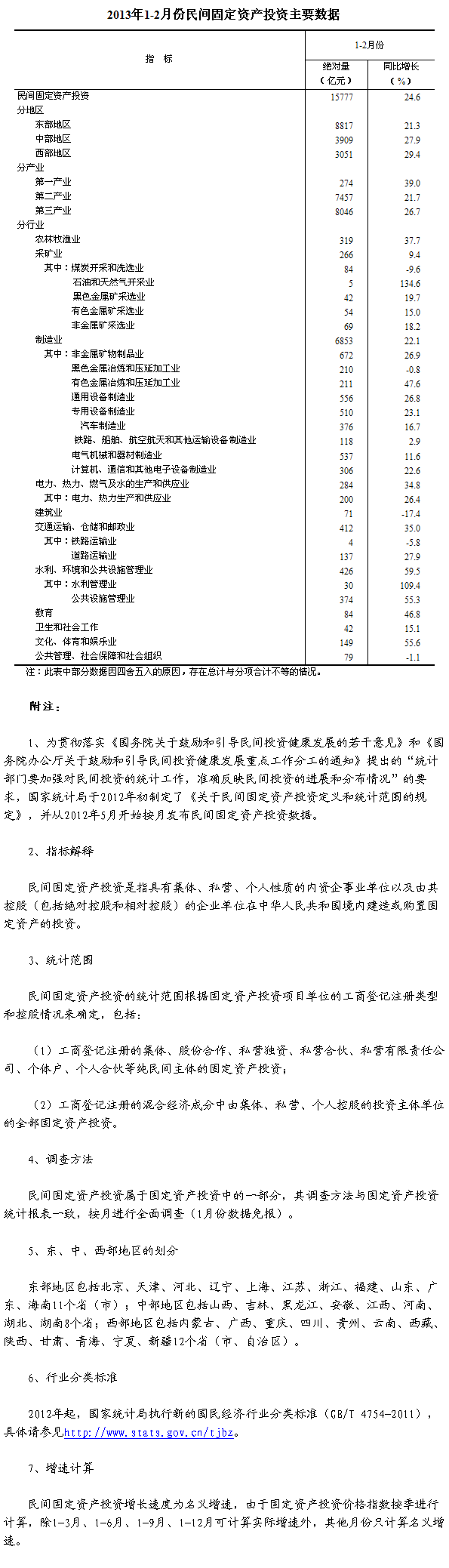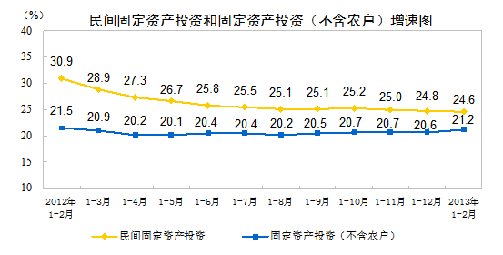 2013年1-2月份,全國民間固定資產投資15777億元,同比名義增長24.6%,增速比去年全年回落0.2個百分點。民間固定資產投資占固定資產投資的比重為61.4%,與去年全年持平。