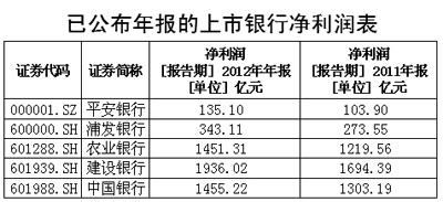 與國有大行相比,股份制銀行仍保持了較高的增速。已發(fā)布業(yè)績快報(bào)的興業(yè)銀行、民生銀行和招商銀行的盈利增幅預(yù)期均超過20%。已公布年報(bào)的平安銀行和浦發(fā)銀行凈利潤分別同比增長約30%和25%。瑞銀證券分析師孫旭預(yù)計(jì),2012年股份制和城商行凈利潤將分別同比增長25%和27%。