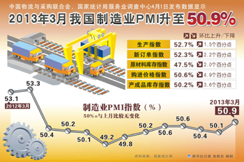 中國物流與采購聯(lián)合會(huì)、國家統(tǒng)計(jì)局服務(wù)業(yè)調(diào)查中心4月1日發(fā)布,3月份中國制造業(yè)采購經(jīng)理指數(shù)(PMI)為50.9%,較上月上升0.8個(gè)百分點(diǎn),連續(xù)6個(gè)月保持在50%以上。