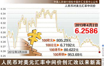 人民幣升值預(yù)期再次升溫。4月2日,人民幣對美元中間價(jià)升至6.2586,創(chuàng)下新高;詢價(jià)交易市場人民幣對美元即期匯率升至6.1986也再次刷新高點(diǎn)。