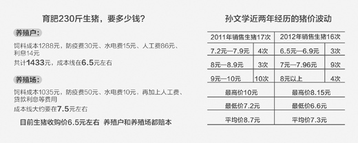 豬價(jià)不穩(wěn),對(duì)養(yǎng)殖戶而言并非新鮮事。在孫文學(xué)的賬本上,記錄著近兩年的生豬價(jià)格波動(dòng)情況:2011年銷(xiāo)售生豬17次,7.2元—7.9元4次,8元—8.9元3次,9元—10元10次,最高價(jià)10元,最低價(jià)7.2元,平均價(jià)8.7元;2012年銷(xiāo)售生豬16次,6.5元—6.9元3次,7元—7.96元9次,8元以上4次,最高價(jià)8.15元,最低價(jià)6.6元,平均價(jià)7.3元。
