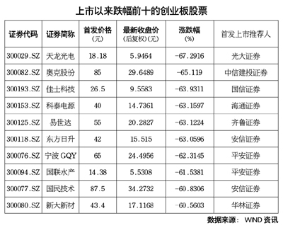 WIND統(tǒng)計(jì)數(shù)據(jù)顯示,自2009年正式開(kāi)板以來(lái),創(chuàng)業(yè)板已經(jīng)有355家上市公司正式登陸A股。WIND統(tǒng)計(jì)數(shù)據(jù)顯示,截至4月12日收盤(pán),即使在創(chuàng)業(yè)板指數(shù)今年以來(lái)整體上漲18.60%的情況下,在355家創(chuàng)業(yè)板公司中,仍然有206家創(chuàng)業(yè)板上市公司的收盤(pán)價(jià)格(后復(fù)權(quán))低于發(fā)行價(jià)格,處于破發(fā)狀態(tài),占比高達(dá)58%。其中,天龍光電、奧克股份、佳士科技、科泰電源、易世達(dá)、東方日升等11只股票12日當(dāng)天的收盤(pán)價(jià)格依然較發(fā)行價(jià)格下跌了60%以上。