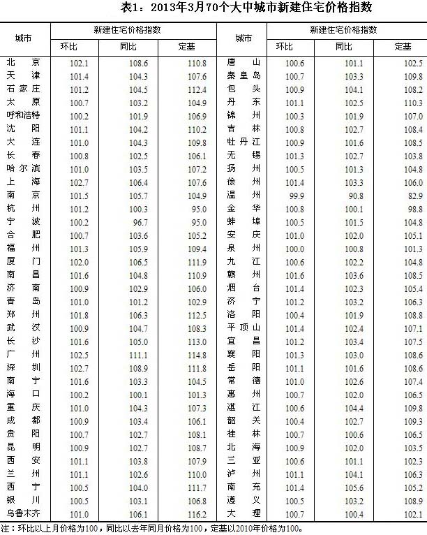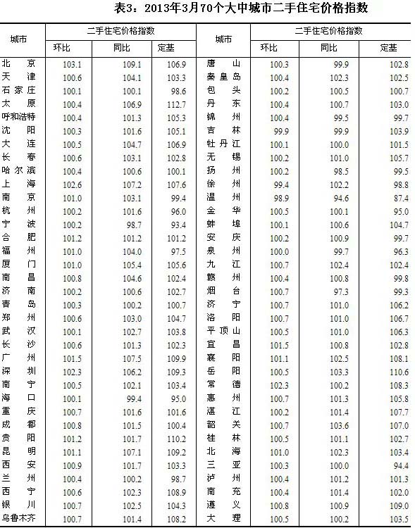 (二)與去年同月相比,70個(gè)大中城市中,價(jià)格下降的城市有2個(gè),持平的城市有1個(gè),上漲的城市有67個(gè)。3月份,同比價(jià)格上漲的城市中,漲幅最高為11.2%。