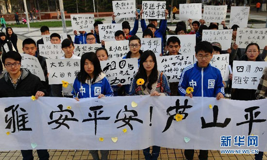 4月20日,山東聊城大學(xué)美術(shù)學(xué)院的大學(xué)生在為雅安地震災(zāi)區(qū)同胞祈福、加油。當(dāng)日8時(shí)02分,四川省雅安市蘆山縣發(fā)生7.0級地震。災(zāi)情牽動(dòng)著億萬同胞的心,人們用不同的方式為雅安地震災(zāi)區(qū)人民祈福,哀悼地震遇難同胞。截至20日16時(shí)40分,雅安蘆山地震已造成四川113人死亡。新華社發(fā)