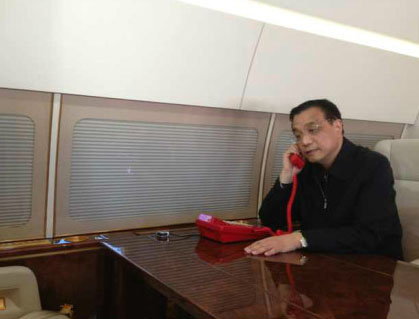 4月20日,在飛往四川途中,李克強總理召開緊急會議,部署抗震救災(zāi)工作。到達機場后,李克強總理一行分乘四架直升飛機,飛往震中。圖為李克強與四川省委書記王東明通電話。(圖片來源:新華視點微博)