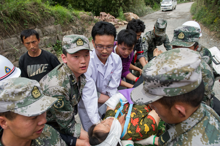4月21日,部隊(duì)官兵和志愿者在坎坷的山路上將傷者送往10多公里外的急救點(diǎn)。 當(dāng)日,記者在蘆山縣寶盛鄉(xiāng)通往龍門鄉(xiāng)的山區(qū)公路上遇到了成都軍區(qū)的10名救援官兵和西南民族大學(xué)的2名志愿者,由于道路在地震中受損嚴(yán)重,他們跑步接力將在余震中受傷的一名傷員抬往10多公里外的鳳西村急救點(diǎn)接受治療。