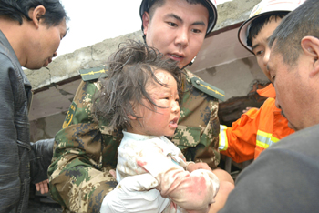 汶川大地震發(fā)生5年后,在距汶川僅85公里的地方,又一場大災緊緊揪住了全國人民的心。4月20日8點02分,四川省蘆山縣發(fā)生7.0級地震,截至4月21日17時,地震已造成184人死亡、24人失蹤,另有11826人受傷。生命隕落,親人哀泣,家園滿目瘡痍,災情舉國震驚。為了生命,分秒必爭!一場來自四面八方的大救援在經(jīng)受災難的土地上譜寫了一曲大愛之歌。 震痛