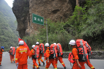 4月21日,四川省南充市消防支隊官兵徒步進入四川寶興重災區(qū)。新華社發(fā) |