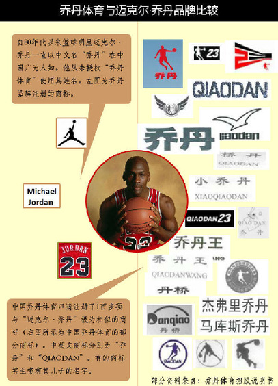 相關(guān)資料顯示,目前國(guó)內(nèi)有逾百個(gè)合法注冊(cè)含“喬丹”、“QIAODAN”字樣或者類似的商標(biāo)。注冊(cè)商標(biāo)涵蓋的行業(yè)更是五花八門,涉及的行業(yè)有食品、服裝、醫(yī)療、飼料、衛(wèi)生潔具不等,其中也不乏體育用品行業(yè)。
