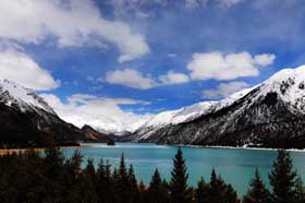 然烏湖北面有著名的來古冰川,冰川延伸到湖邊。每當(dāng)冰雪融化時,雪水便注入湖中。雪皚皚的雪峰,景色如詩如畫。狹長的湖泊蜿蜒十余里后逐漸收縮成一道河谷,河道中許多巖石和小島點綴其間,四季美景都會使人如臨夢幻之境。